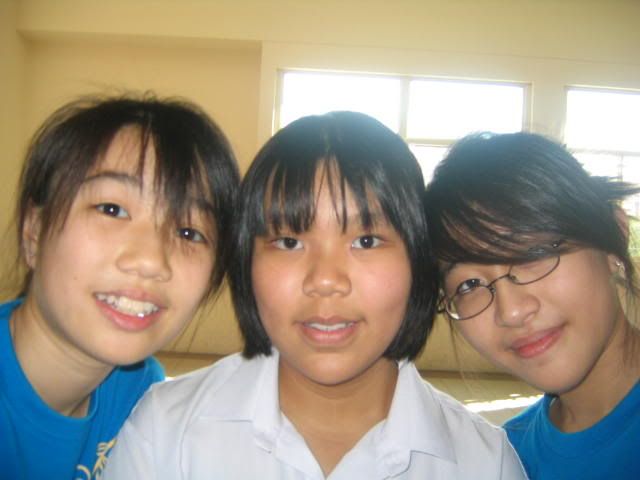 boo. me and piggymah turned in at 3. yeah. woke up at 5.45. to sppse to play pingpong wif ms armstrng at 6. i woke up. to wake piggymah up. ms armstrng weren't dere. we were cheated. wen back. snooze fer lyk 30 mins. dan after breakfast came up to slp fer another hour. powernapping. piggymah's lock got stucked. clumsy her. tot she locked the important documents and starf. but no. tot she locked her raincoat and medication. but no. she locked an empty compartment. hooorayy to her. had activities the whoole dayy. tiring but farrn. and the shifty thing wif piggymah was reali shifty. and i meant. hot news. it so juicy. and they make such a lovely couple. whisperin sweet nothings to each other. oh wells. lovebirrds. went to bridge to take foto of the monsoon sea. it was reali chalky and windy. hongheng and his hair were everywhere. and izzah being obsessed wif herself snappin fotos and everythin'. before dinner and after. had a brief pingpong session wif piggymah. farrn. yarr. duh. its pingpong. we set up a 2 new gangs in a nite. the karaoke khaki ones. and the shifty gang. we were singin our lungs out at the karaoke coner. and we had a blasst dancing our asses off after the singin. all the songs and everything. discofied. till late. and i mean veri late.